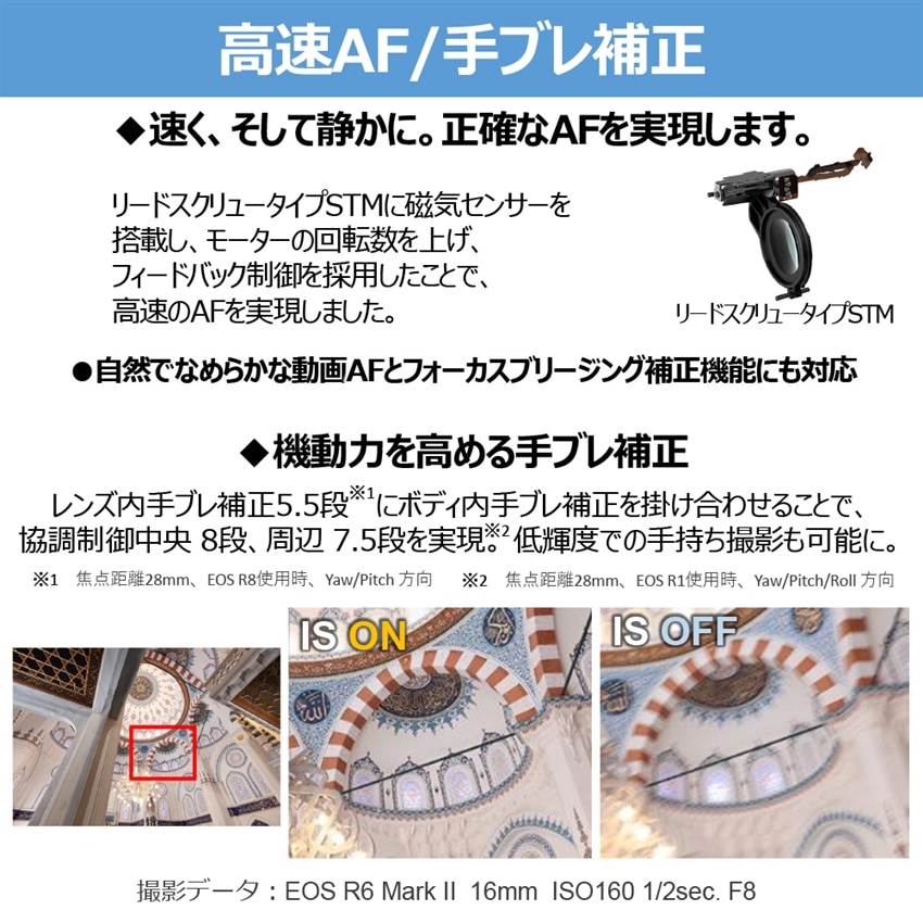 失敗写真の原因になる撮影時の手ブレをレンズ側で補正する、キヤノン独自のレンズ内手ブレ補正。暗所や手持ちでの撮影にも安心して臨めます。