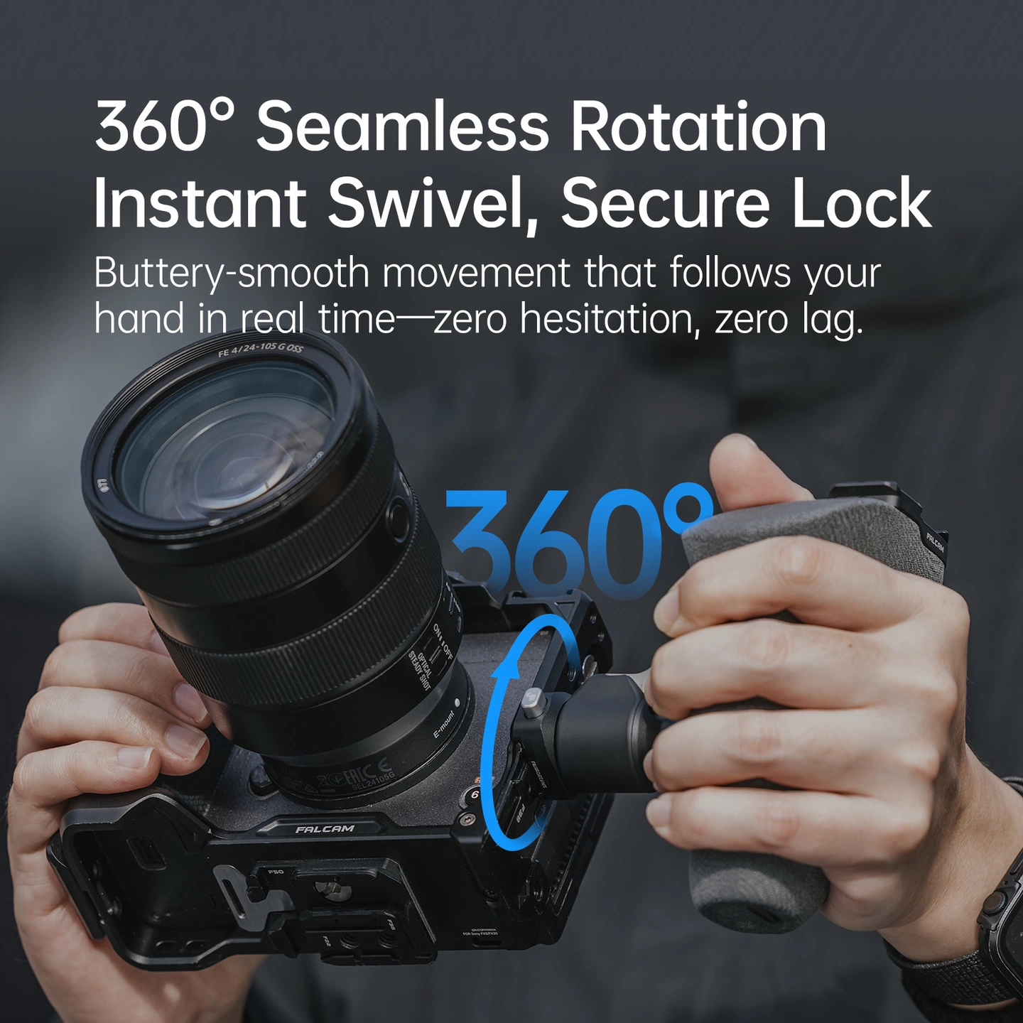 手の動きに追従する回転機構を備え、構図変更やアングル調整をスムーズに行えます。任意の位置で固定でき、安定した撮影をサポートします。