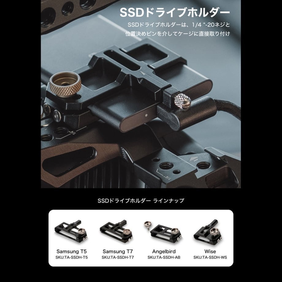 SSDドライブホルダーは、1/4″-20ネジと位置決めピンを介してケージに直接取り付けられます。これにより、SSDドライブをカメラのセットアップに固定し、映像を別のSSDカードに記録することができます。付属のUSB-Cケーブルは、抜け止め仕様で、カメラとドライブを確実に接続することができます。