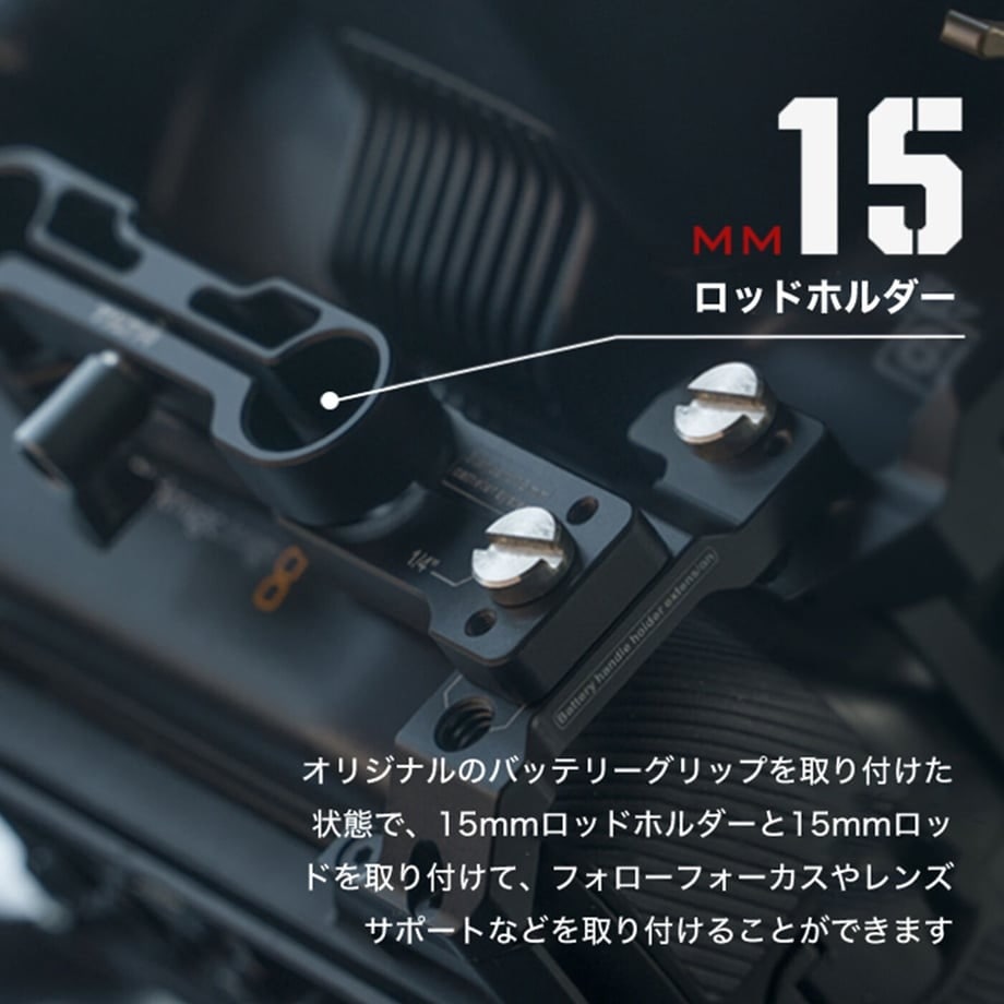 バッテリーグリップをハーフケージで使用する際には、15mmロッドマウントを取り付けて、カメラボディ前方の15mmロッドをサポートすることができます。