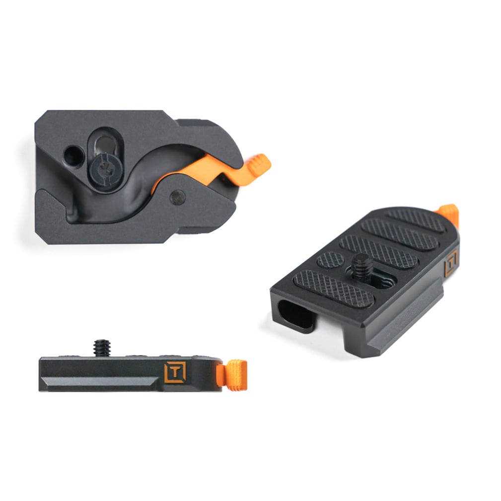 テザーガードレバーロックプレートは、プレートにケーブルを固定してデータ転送中の不意な抜け落ちや接続端子の破損を防ぐ、ケーブルマネージメント用カメラプレートです。軽量ながらも丈夫な金属製のプレートは、アルカスイス互換で裏面には1/4インチネジ穴が空いています。