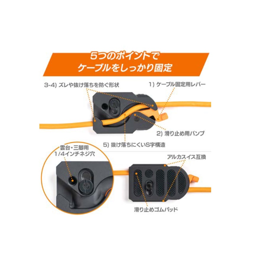 ケーブル用の溝は抜け落ちにくいS字構造を持ち、レバーロックでケーブルをカメラプレートにしっかりと固定できます。