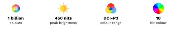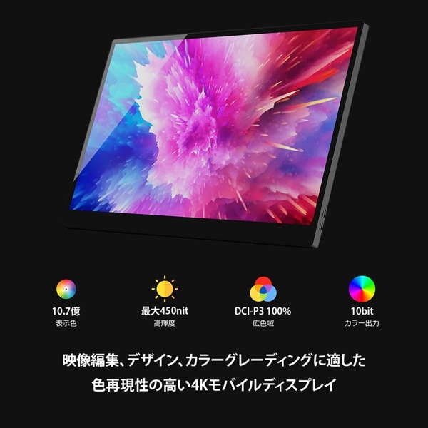 10億色以上を表示可能な10ビットカラーに対応し、DCI-P3カラーレンジを100%カバーする4Kディスプレイを搭載しています。また、ピーク輝度450nitにより、どのような環境でも明瞭で鮮やかな映像を表示できます。