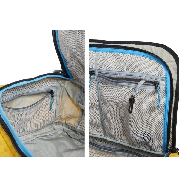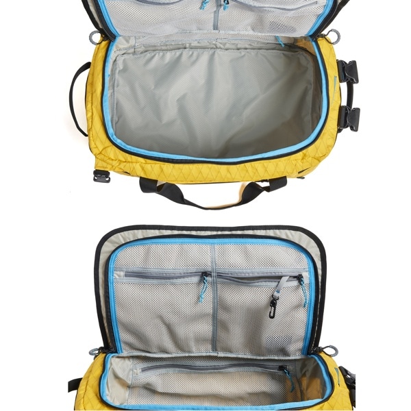 メインコンパートメントはダブルジッパーで大きく開き、多くの荷物を収納可能です。蓋内側にはジッパー付きメッシュポケットが2つ、内部にはジッパー付きのメッシュポケットが各側面に備わっており、嵩張る荷物から小物まで整理整頓して収納できます。また、蓋内側のメッシュポケットの1つにはキーフックとAirTag用ポケットもあります。