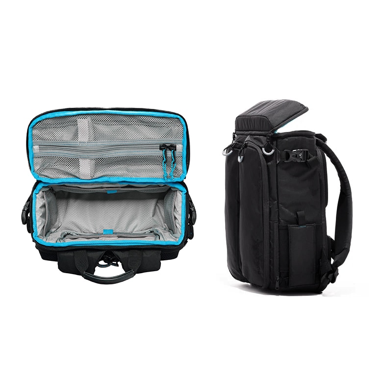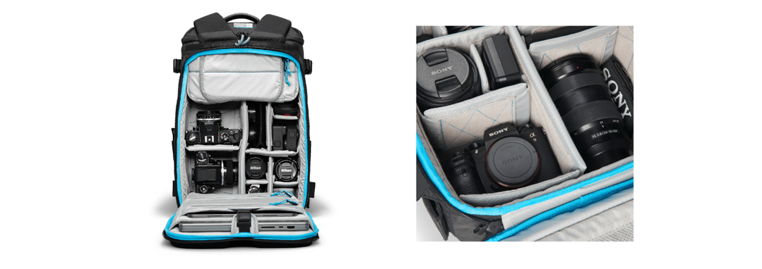 メインコンパートメントへのアクセスは背中側からで、ダブルジッパーにより大きくバックパネルが開き、ジッパーを開ければ上部コンパートメントへもアクセスできます。さまざまな機材収納のパターンに対応できるように充分な数のディバイダーが付属しており、ディバイダーにはオートバイのヘルメットにも採用されるArtilon foam(アーティリオン フォーム)を使用し、薄型で軽量ながら耐衝撃性に優れています。