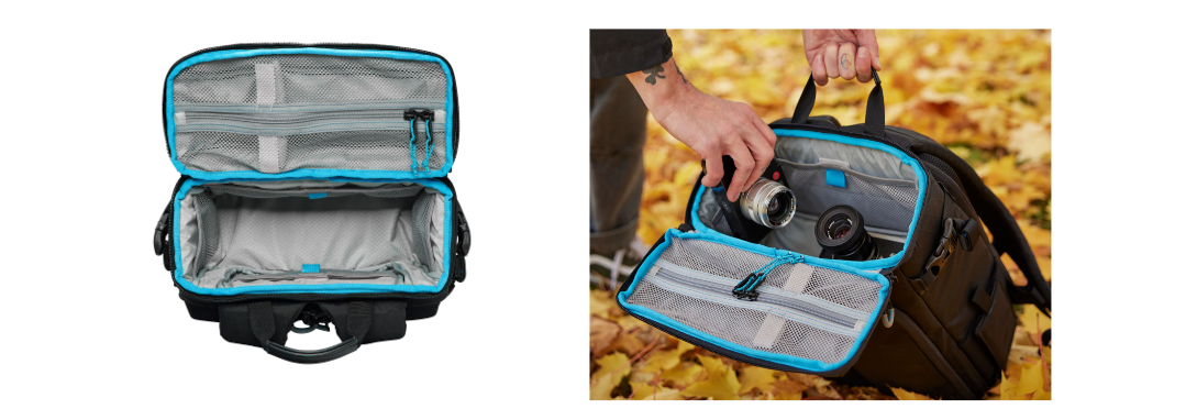 上部コンパートメントを備えた、ミラーレスカメラの持ち運びに適したコンパクトなカメラバックパックです。上部コンパートメントはジッパーで開閉でき、すぐに取り出したい機材やアイテムの収納ができます。蓋内側のメッシュポケットには取り外し可能なディバイダーが1枚付属するため、荷物を整理して収納できます。また、上部コンパートメント内にもメッシュポケットが4つあり、小物類の収納に便利です。