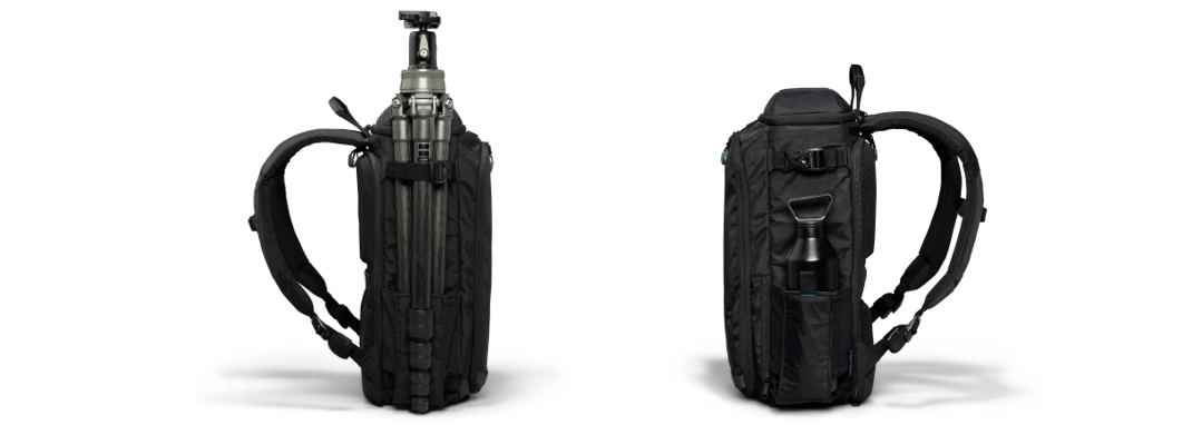 バッグの両サイドにはマグネットで開閉するポケット付き。三脚上部等を固定できるストラップも備わっているため、小型三脚やウォーターボトルの収納に便利です。