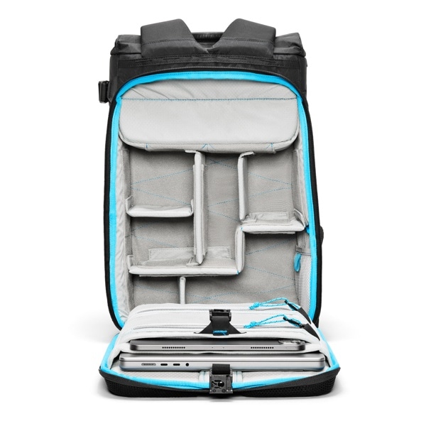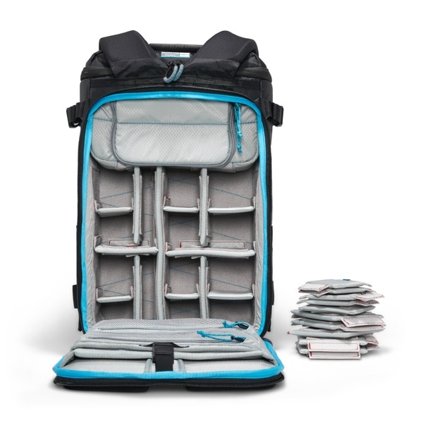 メインコンパートメントへのアクセスは背中側からで、ダブルジッパーにより大きくバックパネルが開きます。さまざまな機材収納のパターンに対応できるように充分な数のディバイダーが付属しており、ディバイダーにはオートバイのヘルメットにも採用される Artilon foam(アーティリオン フォーム)を使用し、薄型で軽量ながら耐衝撃性に優れています。