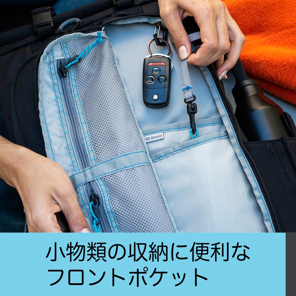 フロントパネルのポケットは2つに分かれています。右側のポケットにはジッパー付きメッシュポケットのほか、ペンホルダー、オーガナイザーポケット、キーフック、別売の「テンボ 12 メモリーカードウォレット」用ランヤード、さらにパスポートなど貴重品を守るRFIDシールド付きのポケットがあります。