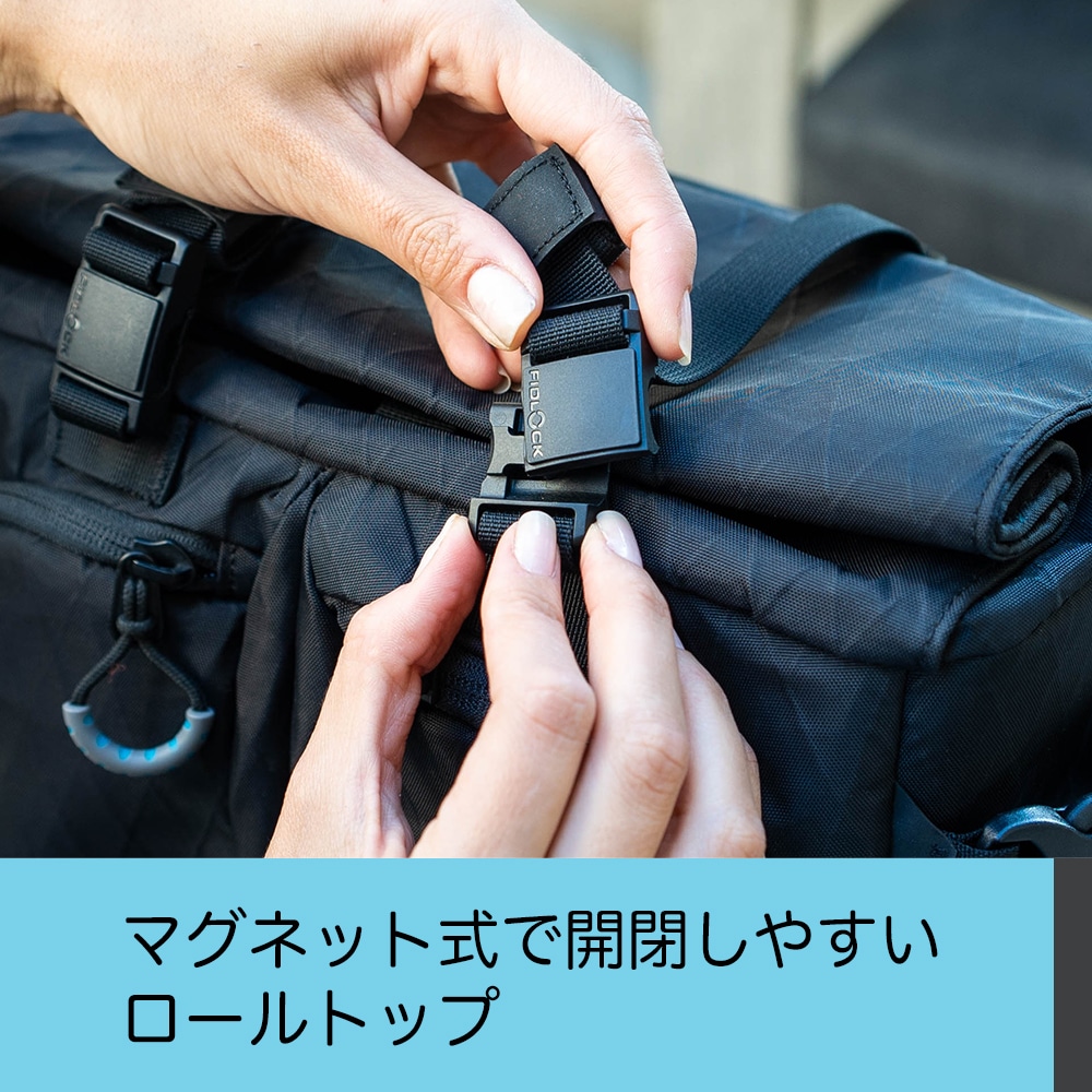 ロールトップの開口部はマグネットで開閉でき、畳んだ後はFIDLOCK社製のマグネット式バックルでしっかりまとめて固定ができます。余ったストラップはマグネットの留め具で簡単にすっきりまとめられます。