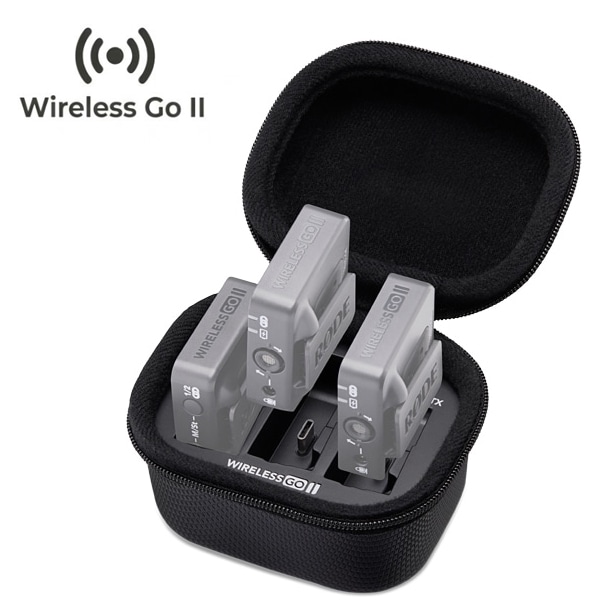 チャージケースは、1本のUSB-CケーブルでワイヤレスゴーIIの送信機2台と受信機1台を効率よくまとめて充電できる、便利な充電ケースです。ケースには内蔵バッテリーを搭載しており、チャージケースにワイヤレスゴーIIを収納するだけで、持ち運びながら充電を行うことができます。