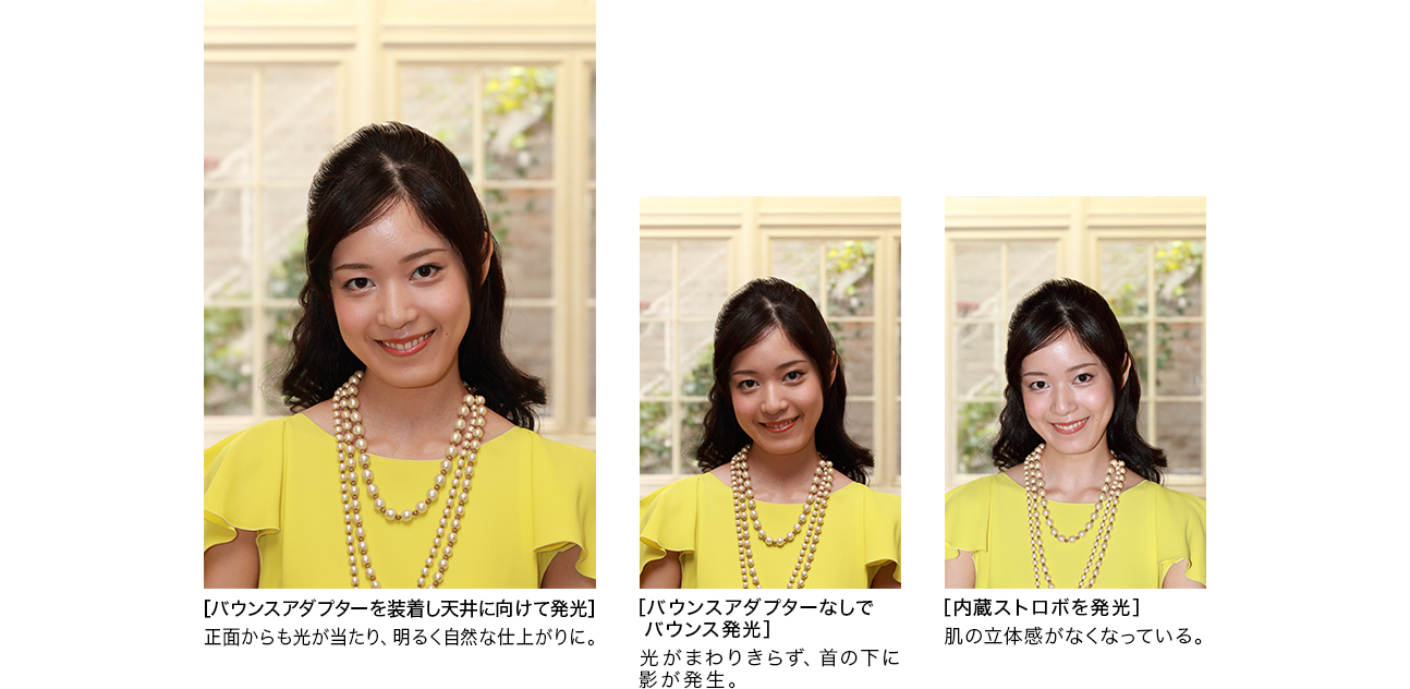 バウンス撮影時、ストロボ光を拡散して和らげ、全体を明るくし、被写体の影を抑えます。ワイドパネルと併用すると、いっそう効果的です。