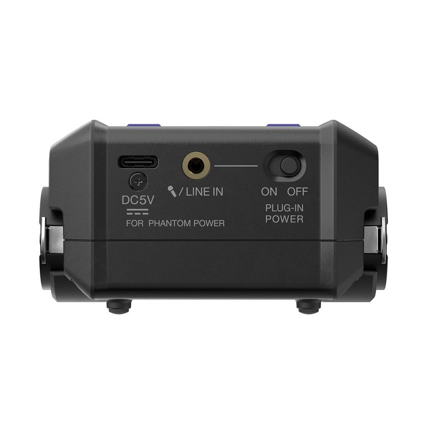 USB-Cポートに外部電源(別売ACアダプタ AD-17またはモバイルバッテリ)を接続すれば、コンデンサーマイクが必要とする+48Vのファンタム電源を供給可能。ステレオミニ入力に接続されたラべリアマイクには、プラグインパワーを供給することができます。32bitフロートオーディオに対応