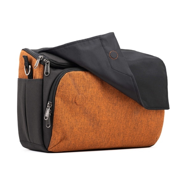 中型ミラーレスカメラ 1 台とレンズ 1-2 本を収納できます。フロントポケットにはキーフック、オーガナイザーポケット 4 つ、メモリーカード用ポケット 2 つがあります。