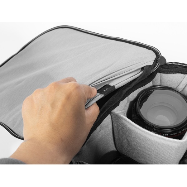 付属の専用クリップでピークデザイン製トラベルバッグのメインコンパートメント内に固定でき、移動中も安心です。