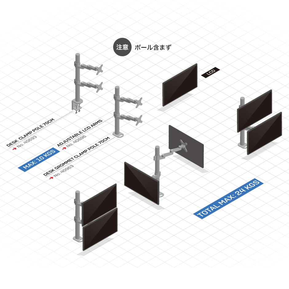 適合するポールを自由に取付け可能なモニタアーム(ポールは別売り、型番:40692、40693、40962、40963)