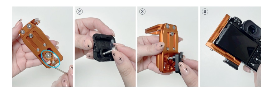 アダプタープレート装着用 1/4 インチカメラネジをアダプタープレートに差し込み(②)、ブラケットに取り付けて固定します(③④)。