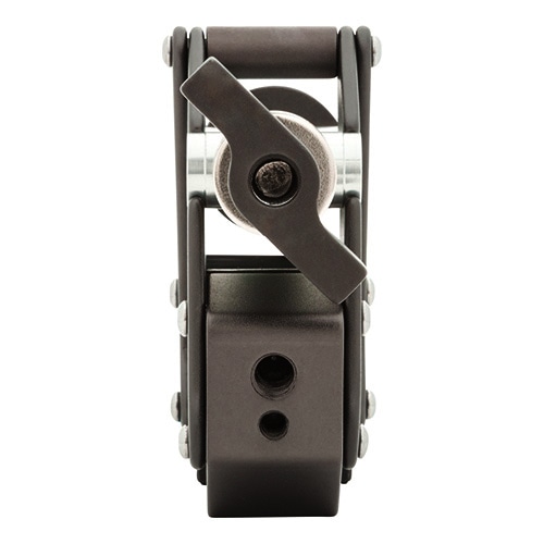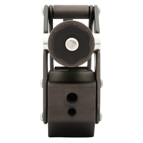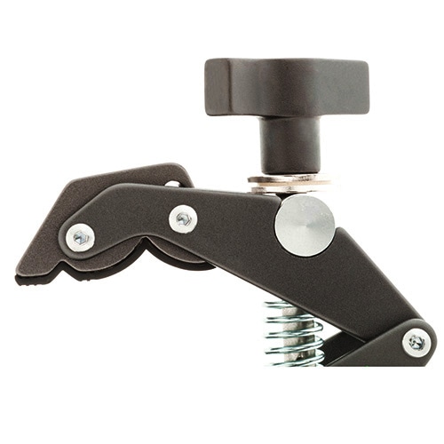 クランピング部に特徴のある、汎用性の高いクランプです。独特な形状を持つクランピング部は先端可動式となっているため、取付け先の形を選びません。クランプの上下それぞれに3/8 インチネジ穴と1/4インチネジ穴が付いており、合計30kgまでのアイテムを搭載可能です。先端可動式で汎用性の高いクランプ