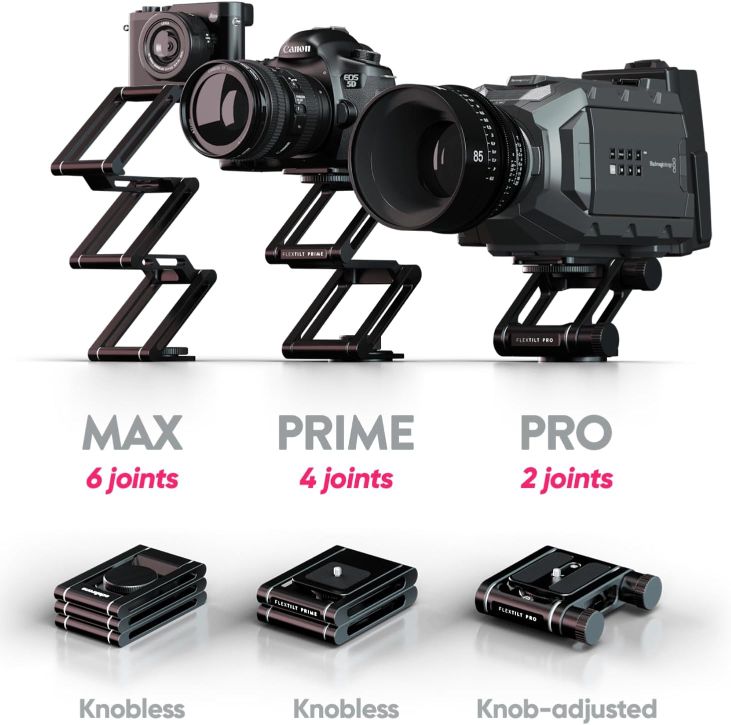 | ボックスの内容 | - フレックスチルトマックス - 張力調整六角レンチ(別売) | - フレックスティルトプライム - 張力調整六角レンチ(本体に収納) | - フレックスティルトプロ - 標準カメラに接続するための追加の 1/4 インチネジ。 |