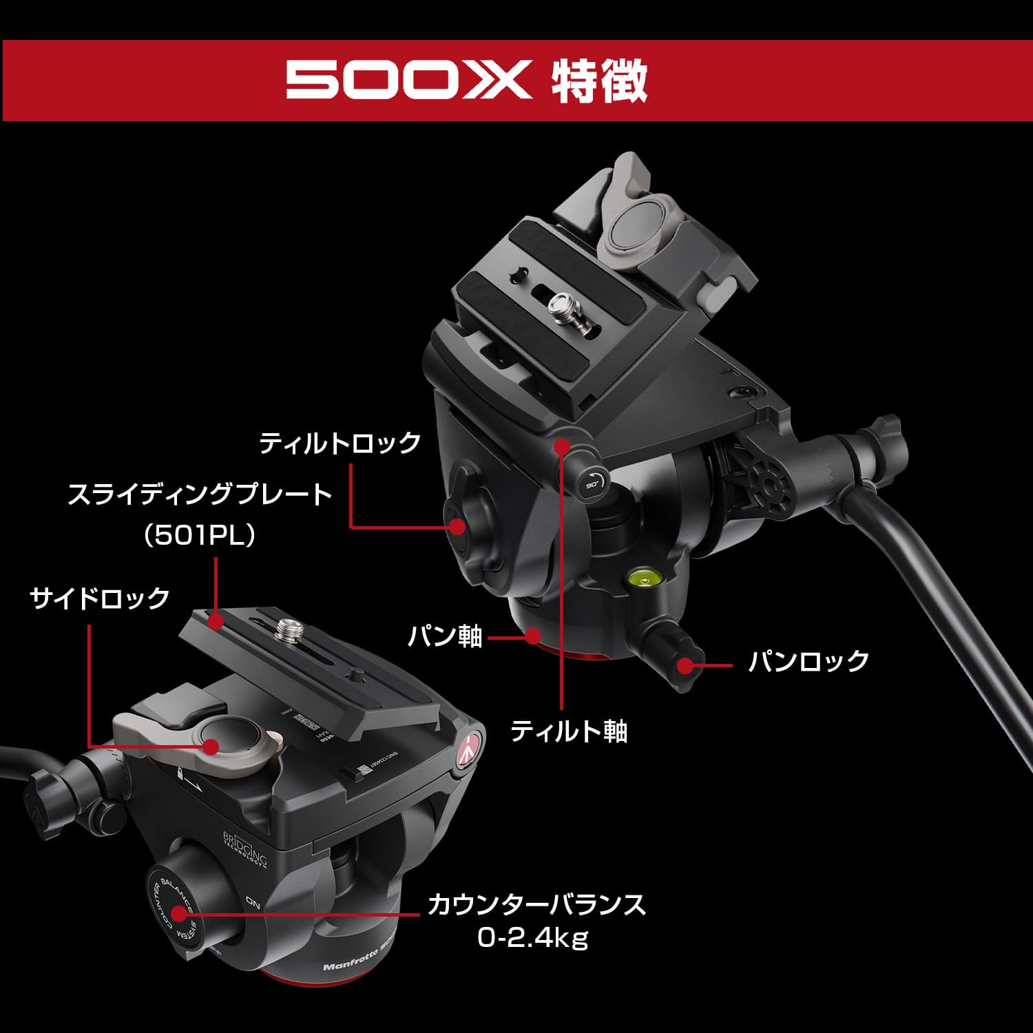 | 項目 | 500X フルード雲台 | ONE アルミ三脚 + 500X 雲台キット | ONE カーボン三脚 + 500X 雲台キット | アルミニウム製ツインレッグ三脚 500X フルード雲台キット |