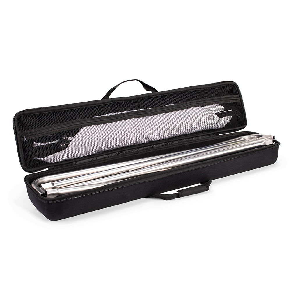 フレームは2mx2.3mと十分なサイズでありながら省スペースで設置することができます。壁に立てかけるだけでなく、同時発売のLL LA8452(イージーフレーム用アルミフレームサポートレッグ)と組み合わせれば自立させることができます。LL LA8452はキットに付属のキャリングケースに収納することができます。