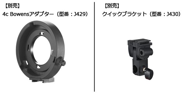 また、4c(4つ爪)マウントを汎用性の高いBowensマウントに変換できる4c Bowensアダプター(型番:J429)も別途ご用意しており、お手持ちのBowensマウントアクセサリーと合わせてお使いいただくことも可能です。