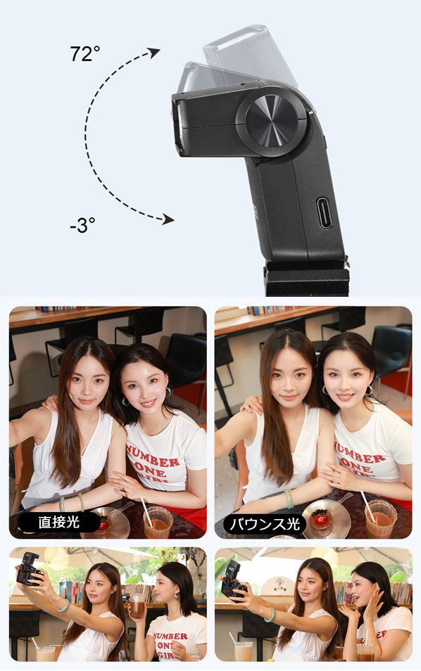 コンパクトな形状ながら、フラッシュヘッドは上下方向に?3°~72°まで角度調整が可能。