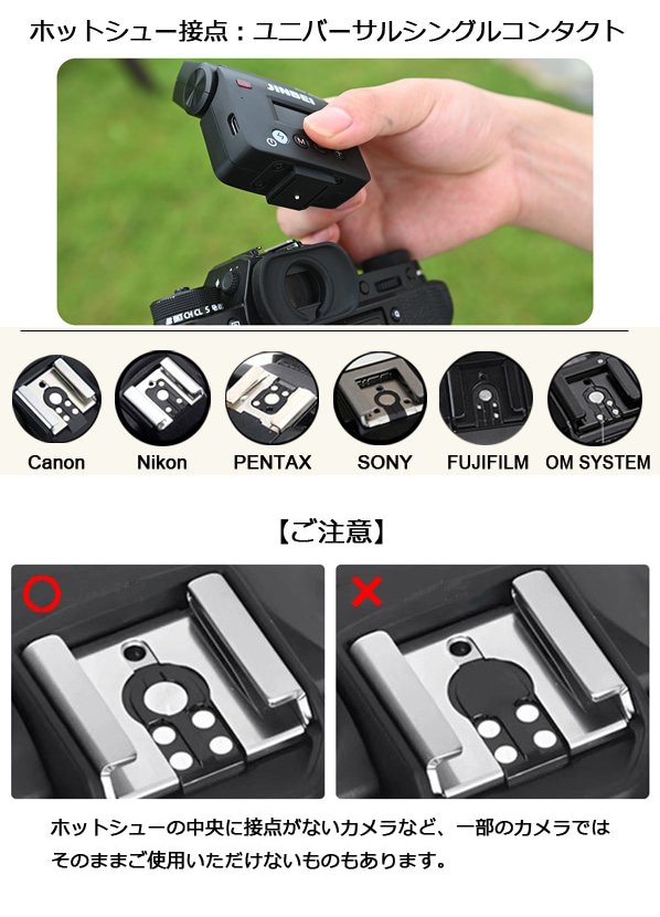 Canon、Nikon、SONY、FUJIFILM、Panasonic、OM SYSTEM、PENTAXなど、各社主要カメラの標準ホットシューベースに取り付け可能です。