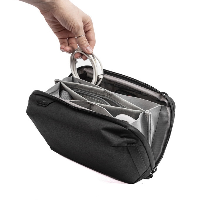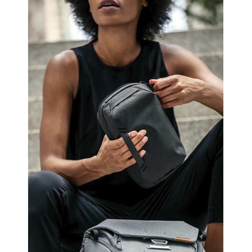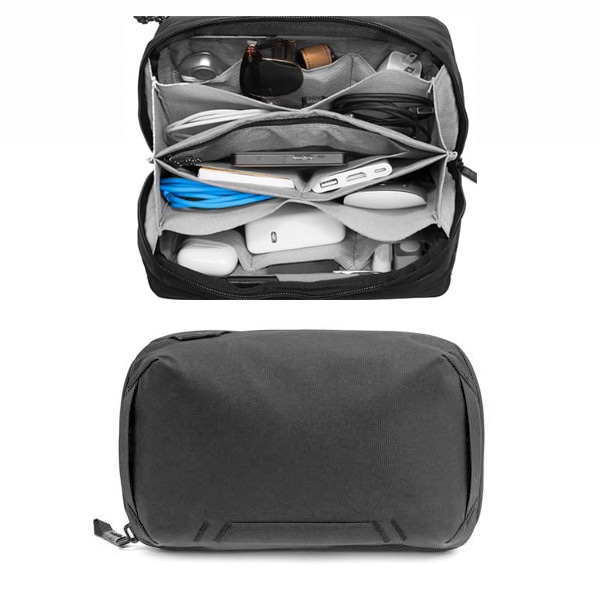 ケーブルやバッテリー、SDカードなどの小物類を整理・収納するために設計されたポーチです。上部にハンドルが付いており、携帯性にも優れています。