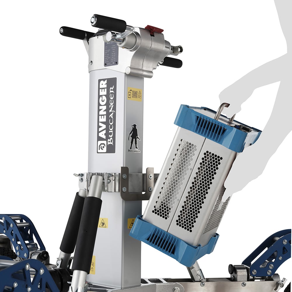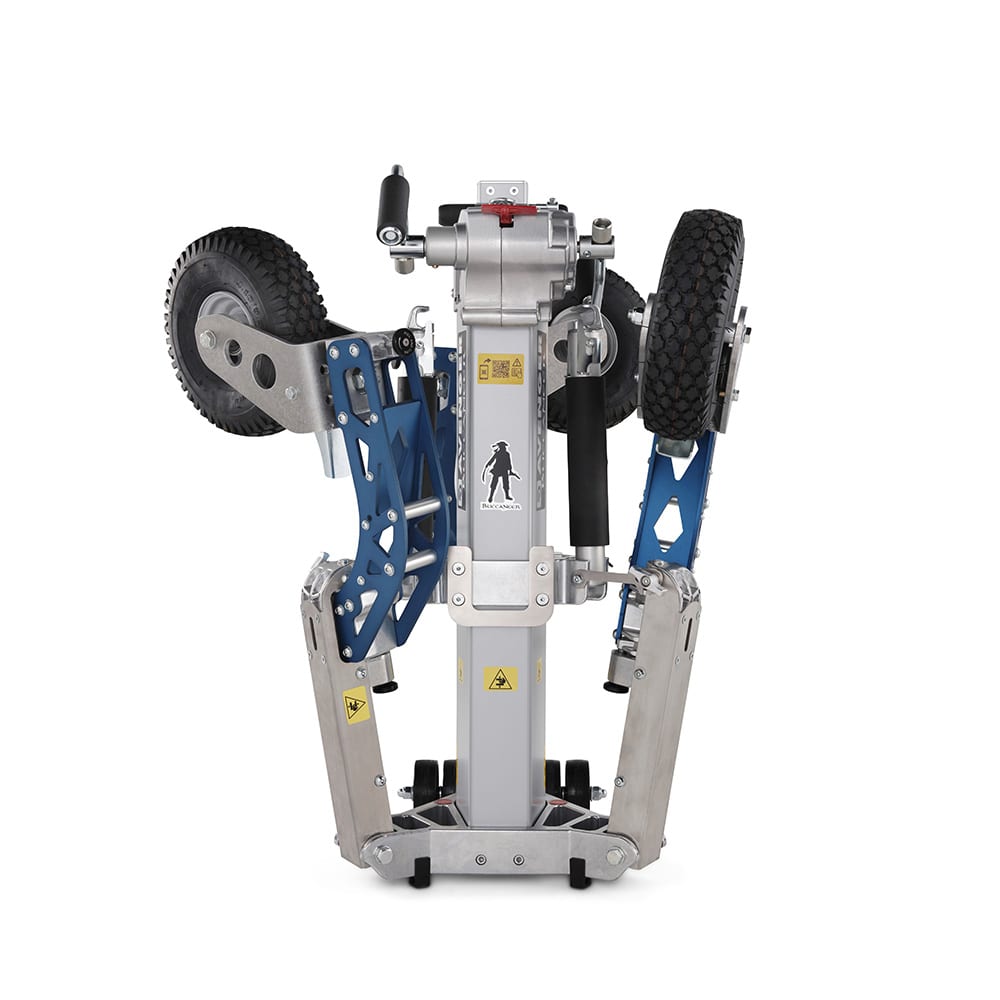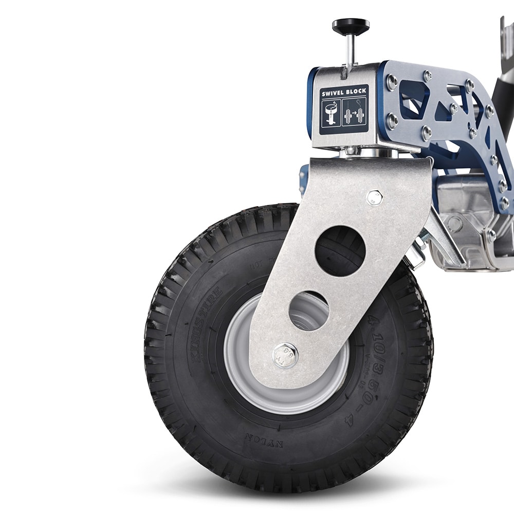 ホィール部を折りたたむと非常にコンパクトになります。トランスポート用のハンドルと小型ホィールにより楽に運ぶことができます。エア抜けをしないフォームフィルホィールと移動に便利な 3方向のホィール軸ロック