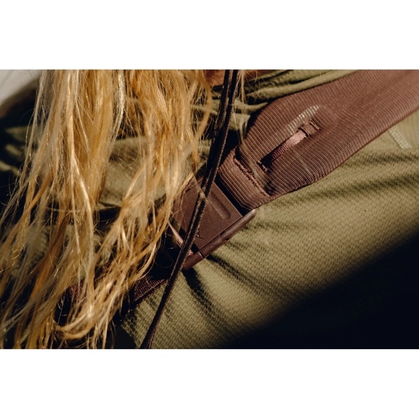 バッグ外側には軽さと耐久性のバランスに優れ、耐候性のある100%リサイクル素材「Terra Shell™(テラシェル)210D リップストップナイロン」を採用。背面には、通気性のあるナイロンメッシュを使用しています。