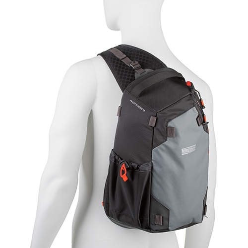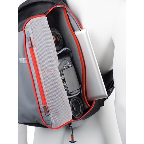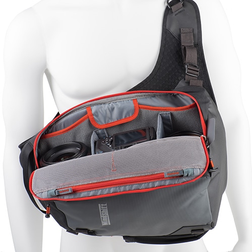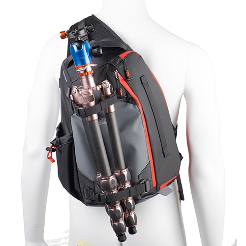 高密度な撥水生地で撮影機材を保護するスリングバッグ