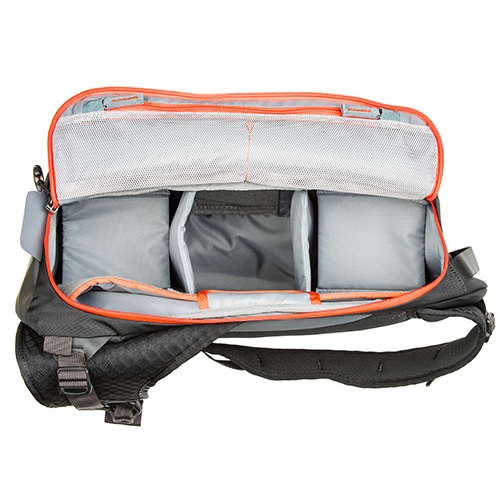 フォトクロス スリングバッグはアウトドアフォトグラファーがカメラバッグに求めるタフさを兼ね備えています。高密度な撥水生地、分厚いターポリンの防水ボトムで撮影機材を保護し、あらゆる天候からカメラ機材を守ります。また、長時間フィールドで背負っていても快適に使用できるように設計されています。移動中などでカメラを必要としない場面では3点式スリングでぴったりと体にフィットしながらも、撮影を行う際は素早くカメラにアクセスすることができます。2サイズ、2色展開。収納例